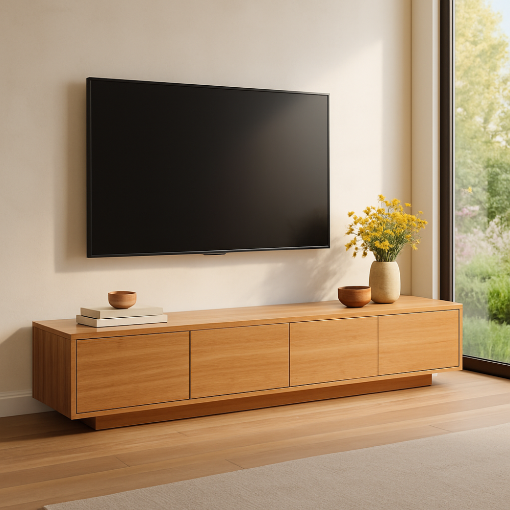 اقتني هذه الطاولة الانيقة لوضع التلفاز بلمسة راقية مصنوعة من الخشب المتين بتشطيب مصقول وجذاب يمنحه شكل عصري كما يوجد 4 ادراج تخزين مما يوفر مساحة مميزة للتخزين وإمكانيه للتعليق على الحائط.