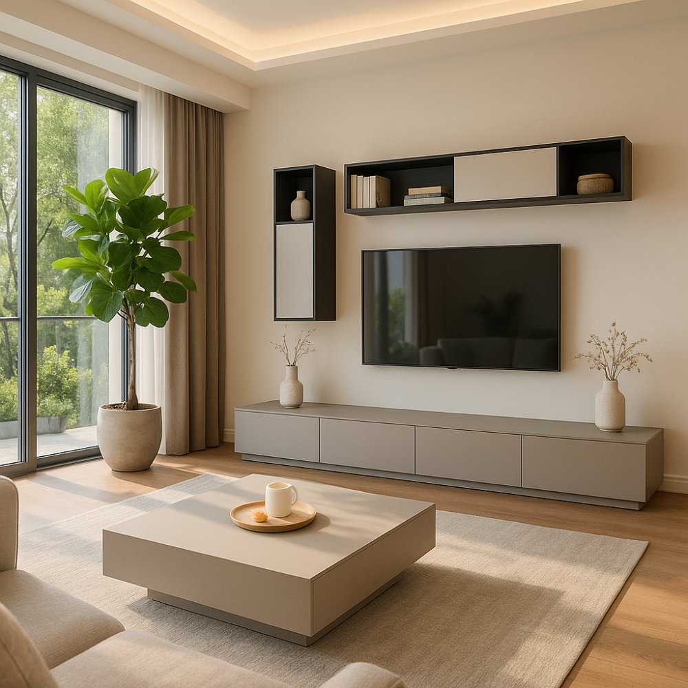 - الاستخدام: طاولة تلفاز ومكتبة لتنظيم المساحة